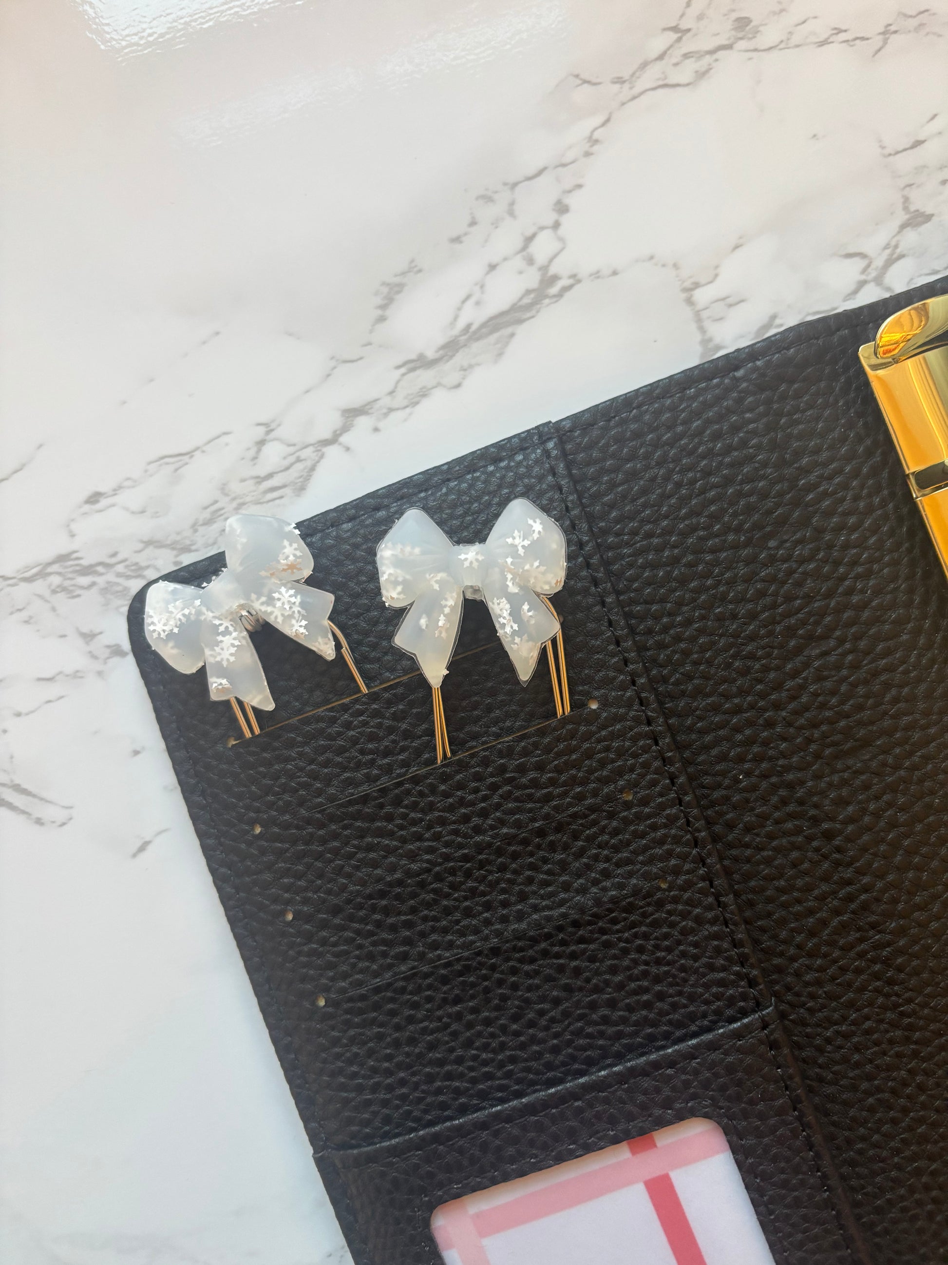 Add a touch of winter wonder to your planner, journal, or binder with this Snowflake Bow Binder Charm. Featuring a delicately sculpted snowflake accented with a dainty bow, this charm blends seasonal sparkle with timeless charm. Made from high-quality enamel and plated metal, the crisp white and shimmering silver tones catch the light beautifully — perfect for holiday planning or year-round style with a frosty twist. This Binder Charm is set on a silver paperclip.